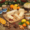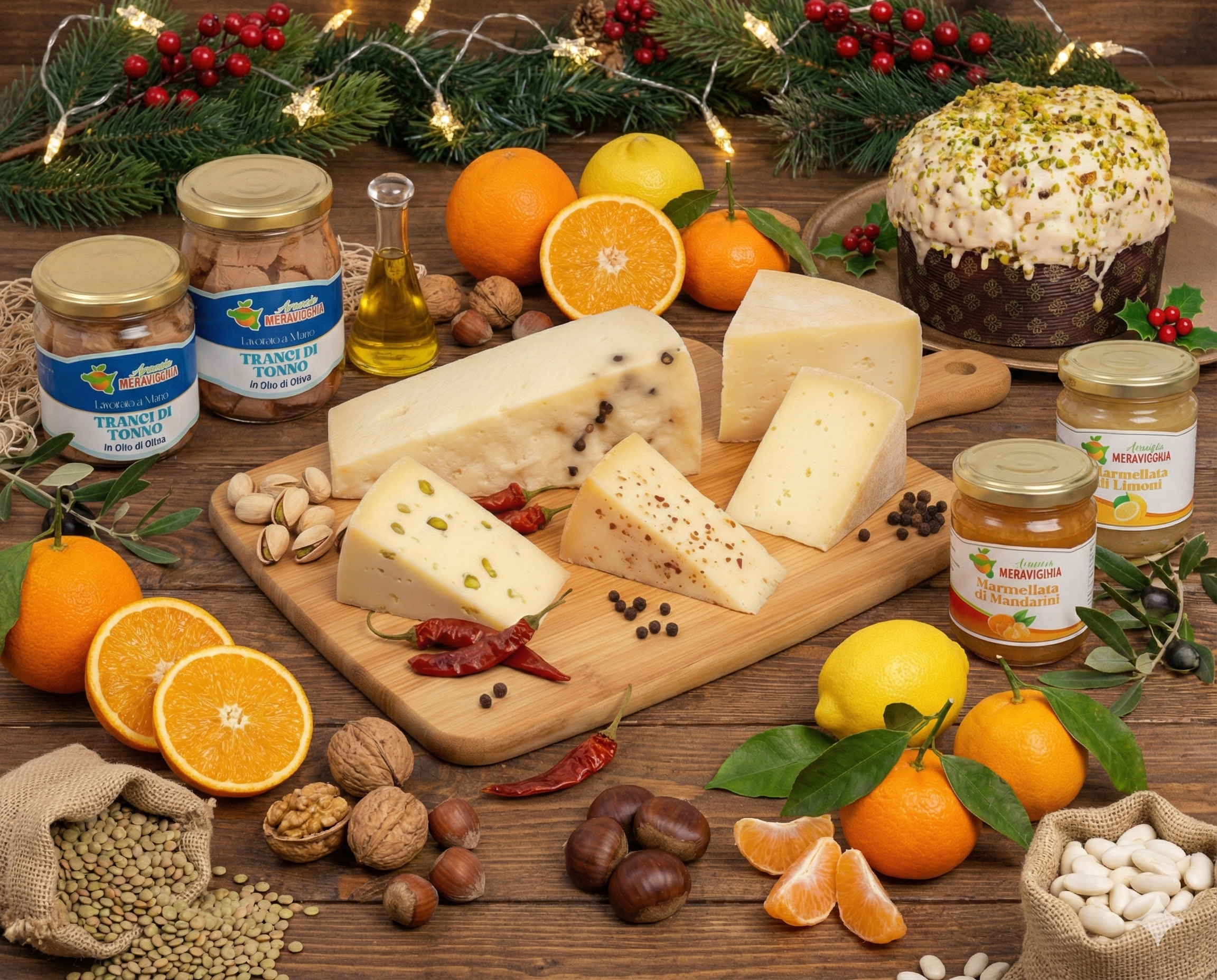 Un panettone a scelta, 1kg di lenticchie, 500g di castagne secche, 2kg di agrumi a scelta, 500g di noci, paste di mandorla (500g), olio extravergine d’oliva (1lt), 500g di fichi secchi, 300g di datteri jumbo, un barattolo di tonno (270g), un barattolo di acciughe (80g), un barattolo di miele a scelta (500g), 500g di mandorle tostate e una provola o un formaggio dal peso di 500g.